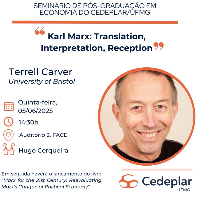 Informamos a realização do seminário com o Professor Terrell Carver, da University of Bristol (UK), que irá apresentar o trabalho intitulado "Karl Marx: Translation, Interpretation, Reception". O evento faz parte da série de seminários do Programa de Pós-Graduação em Economia do Centro de Desenvolvimento e Planejamento Regional da Faculdade de Ciências Econômicas (CEDEPLAR/FACE/UFMG). A visita de Carver a UFMG está sendo organizada pelo Prof. David Gomes, da Faculdade de Direito, que também é doutorando e pesquisador do Cedeplar.