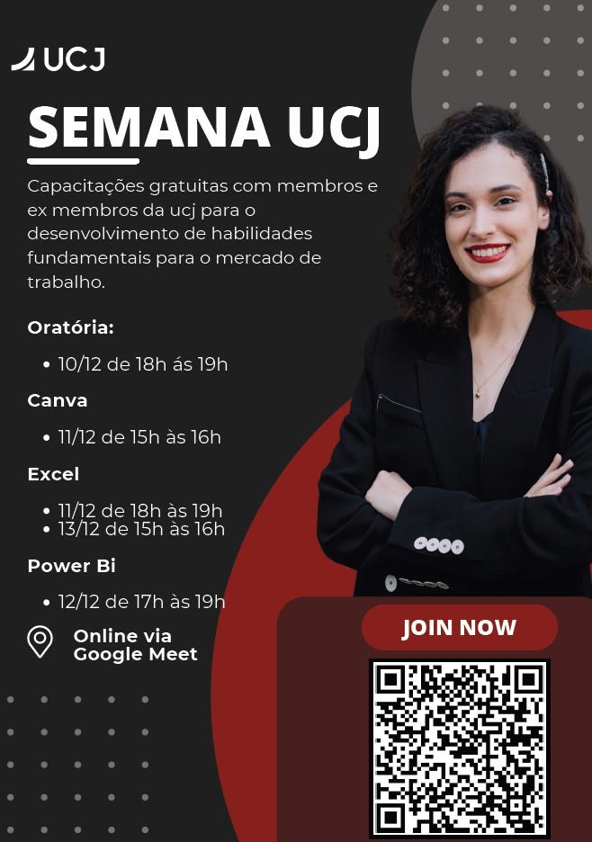 O evento é desenvolvido pela UCJ - UFMG Consultoria Jr. e ocorrerá entre os dias 10 e 13 de dezembro, contando com capacitações gratuitas em Excel, Power BI, Oratória e Canva.