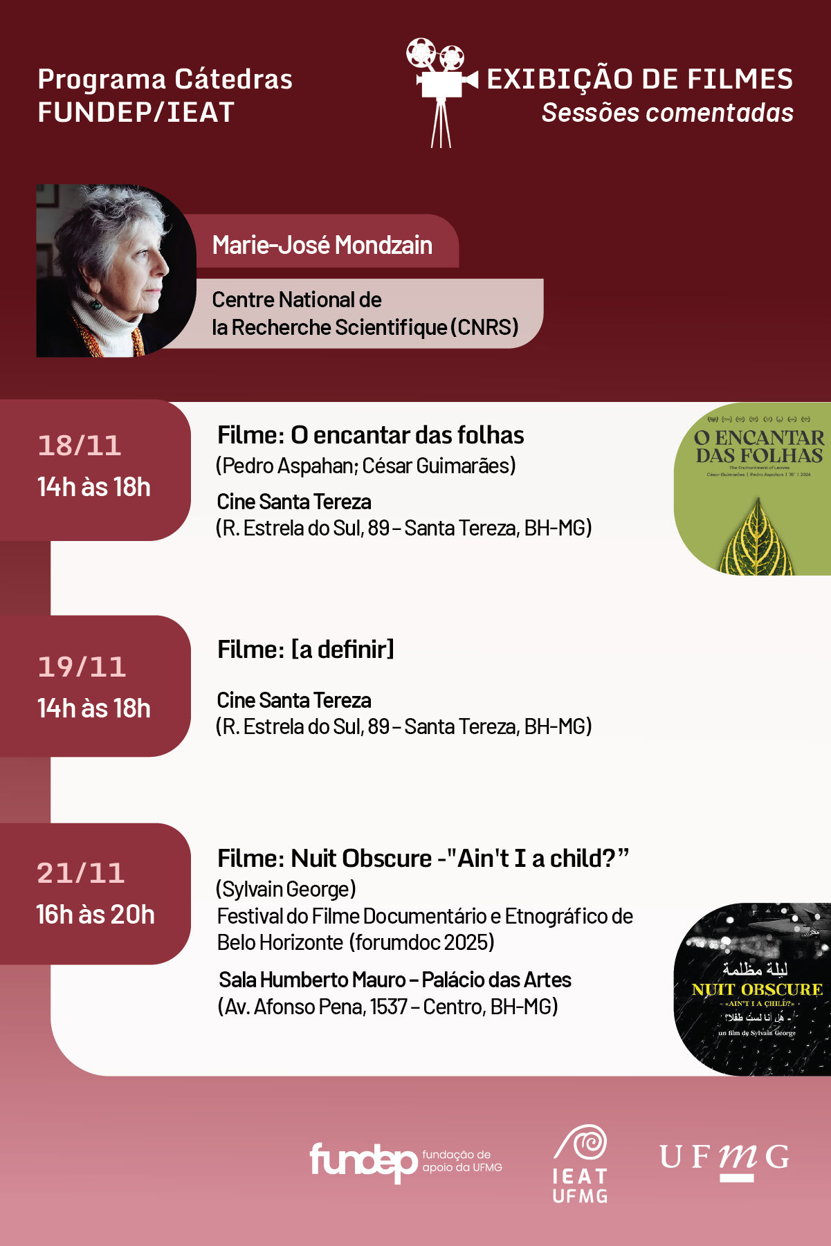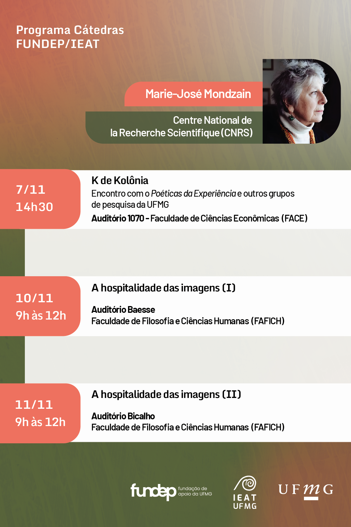 A filósofa francesa Marie-José Mondzain, referência internacional nos estudos sobre a imagem, estará na UFMG durante o mês de novembro como catedrática do Instituto de Estudos Avançados Transdisciplinares da UFMG (IEAT/UFMG).