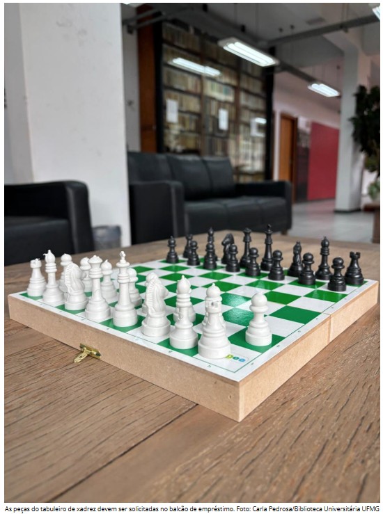 Na Biblioteca da Face, os alunos devem solicitar as peças do jogo de xadrez no balcão de empréstimo e o tempo máximo de permanência com elas é de quatro horas.
