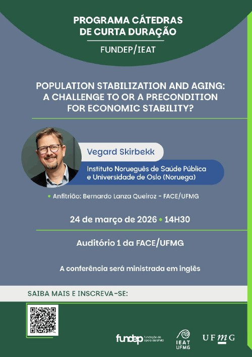 https://www.even3.com.br/grande-conferencia-do-ieatufmg-population-stabilization-and-aging-a-challenge-to-or-a-precondition-for-economic-stability-catedratico-vegard-skirbekk-696961/ - Saiba mais: https://www.ufmg.br/ieat/noticia/pesquisador-noruegues-vegard-skirbekk-realiza-conferencia-sobre-mudancas-demograficas-na-ufmg/