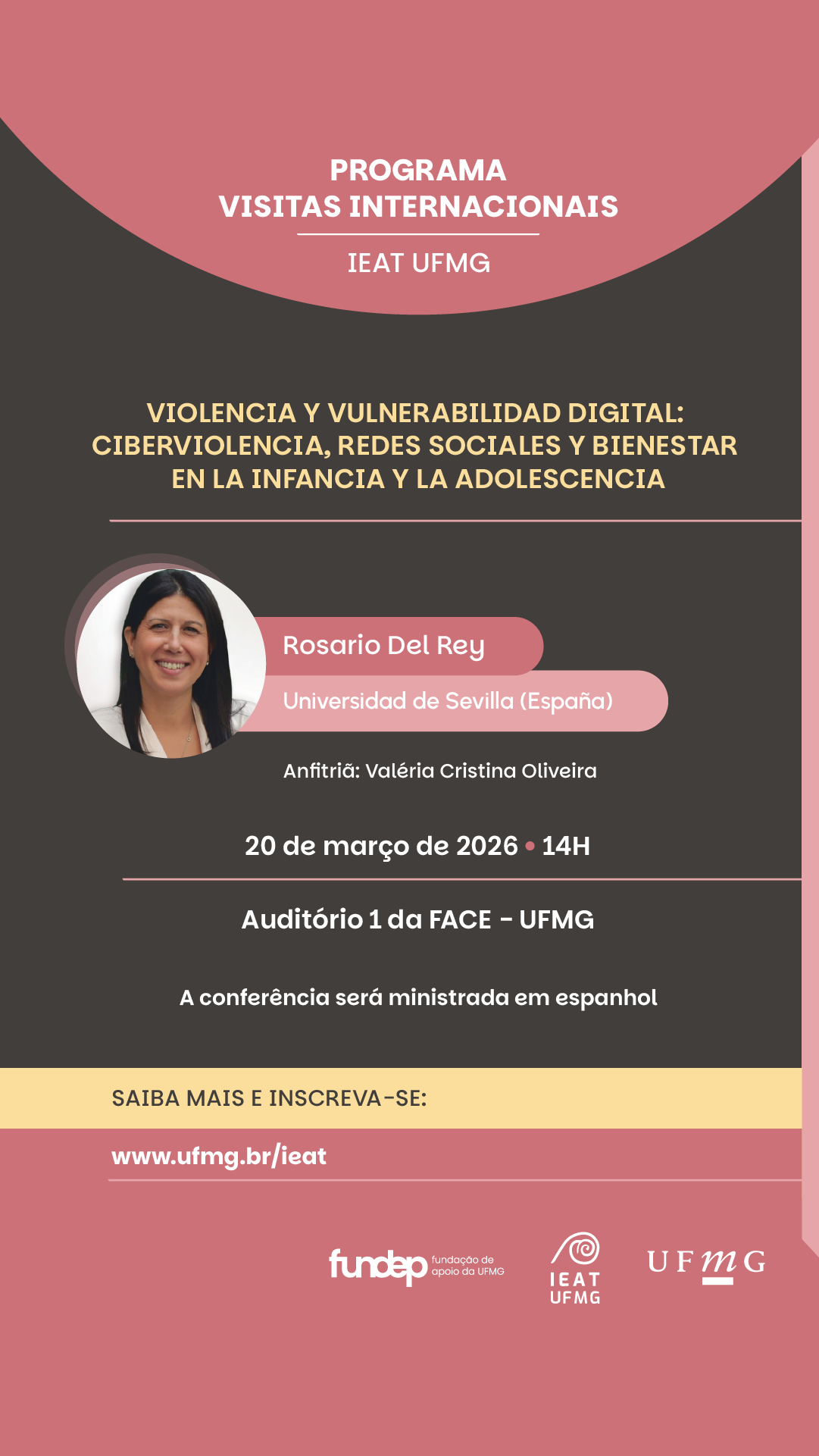 O IEAT/UFMG vai receber este mês a pesquisadora Rosario Del Rey, catedrática da Universidad de Sevilla na Espanha), para ministrar a conferência Violencia y Vulnerabilidad Digital: Ciberviolencia, Redes Sociales y Bienestar en la infancia y la adolescência.