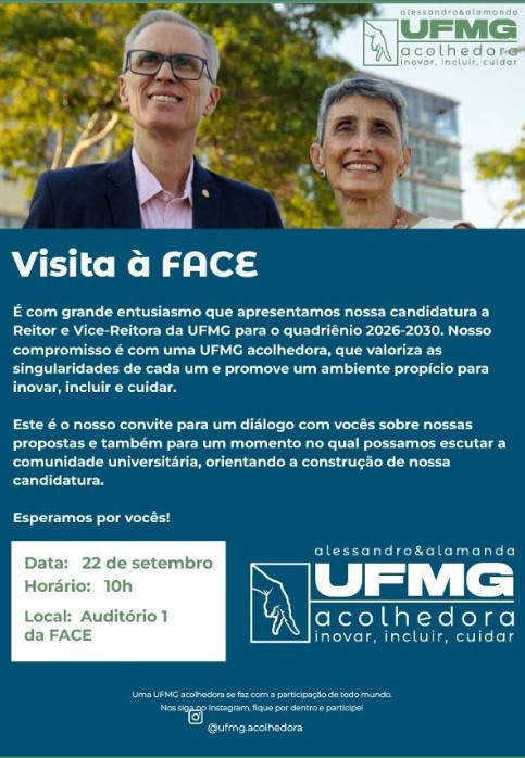 Gostaríamos de reforçar o convite para o encontro que ocorrerá no dia 22 de setembro (segunda-feira), às 10h00, no Auditório 1 da FACE, com os candidatos ao cargo de Reitor e Vice-Reitora da UFMG para o quadriênio 2026-2030.